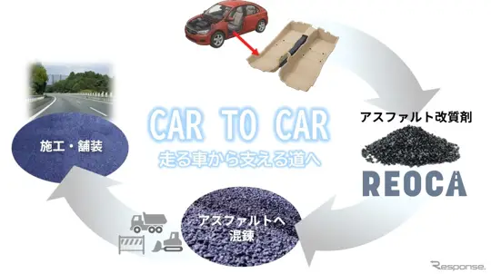 Проект реализован в сотрудничестве с Toyota Boshoku. Суть решения — превратить сложный композит не в «топливо для печи», а в сырьё, которое реально работает в инфраструктуре. Компания описывает это как расширенный цикл «Car to Car»: из автомобильного салона — в материал для будущих дорог.