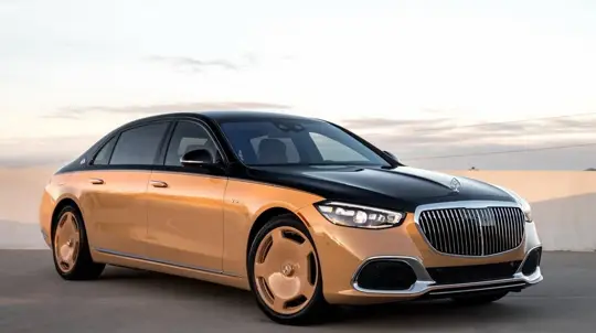 Данная машина выделяется фирменной двухцветной схемой: чёрный верх и песочно-бежевый низ, причём в тон окрашены и колёса. Между цветами — тонкая декоративная линия, а хром и эмблемы Maybach сохраняют привычную «парадность» флагмана. В салоне та же идея контраста: бежевые нижние зоны отделки и чёрный верх, плюс глянцевые вставки, металл, развитая подсветка и цифровые экраны.
