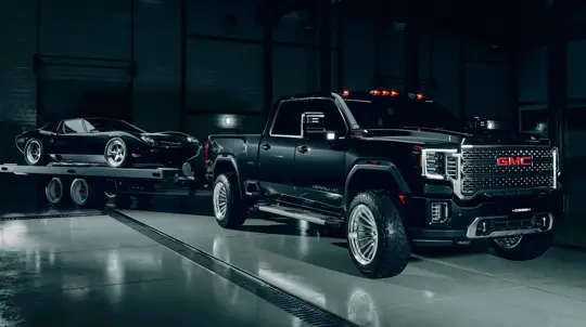 По задумке, современный тяжелый пикап в версии Denali 4WD «буксирует» Miura SV в темном гараже. Sierra Denali HD оснащается 6,6-литровым бензиновым V8 мощностью 401 л.с. или 6,6-литровым турбодизелем Duramax на 470 л.с. с крутящим моментом 1 322 Нм. В проекте пикап получил кованые диски Vossen GNX-01 диаметром от 20 до 26 дюймов.