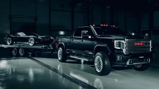 The concept features a modern heavy-duty pickup in Denali 4WD trim "towing" a Miura SV inside a dark garage. The Sierra Denali HD comes equipped with a 6.6-liter gasoline V8 producing 401 horsepower, or a 6.6-liter Duramax turbodiesel delivering 470 horsepower and 1,322 Nm of torque. For this project, the pickup received forged Vossen GNX-01 wheels ranging from 20 to 26 inches in diameter.