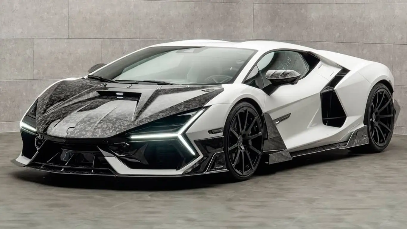 Nadwozie wykończono kutym karbonem — pojawiła się nowa maska, zderzak, dyfuzor oraz poszerzone progi. Z tyłu znalazł się podświetlany emblemat Mansory, a wnętrze całkowicie przetapicerowano w czerni i bieli, łącząc skórę z Alcantarą. Dwukolorowe wykończenie i wyostrzony pakiet nadwozia potęgują dramatyzm, nie zdradzając jednak rdzennego charakteru auta. Taki zestaw bardziej gra emocjami niż rozsądkiem — i pasuje Revuelto wyjątkowo naturalnie.