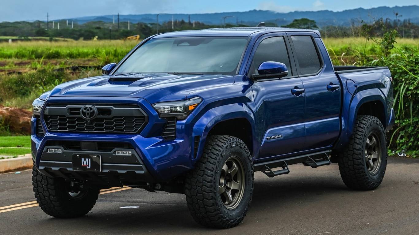 MJ Motorsports из Гонолулу представила эффектный кастомный Toyota Tacoma TRD в цвете Blue Crush Metallic. Пикап оснастили 2,5-дюймовым лифт-комплектом Eibach Stage 2R, бронзовыми 18-дюймовыми дисками Work Meister S1 с вылетом +18 и внедорожными шинами Mickey Thompson Baja Boss Ats размером 295/70/18.Ателье известно минималистичными доработками пикапов и внедорожников Toyota Tacoma и 4Runner последних поколений, где упор делается на клиренс, колёса и внедорожные шины, сохраняя кузов в заводском цвете для гармонии с гавайскими пейзажами.Скорее всего, перед нами версия TRD Sport Double Cab 2025 года с 2,4-литровым турбомотором мощностью 278 л.с. и подключаемым полным приводом. Базовая цена такого авто — от $39 400. Эта комплектация предлагает цифровую панель 12,3 дюйма, амортизаторы TRD Sport и выбор между «механикой» и 8-ступенчатым «автоматом». Такой Tacoma — идеальный вариант для тюнинга и приключений.
