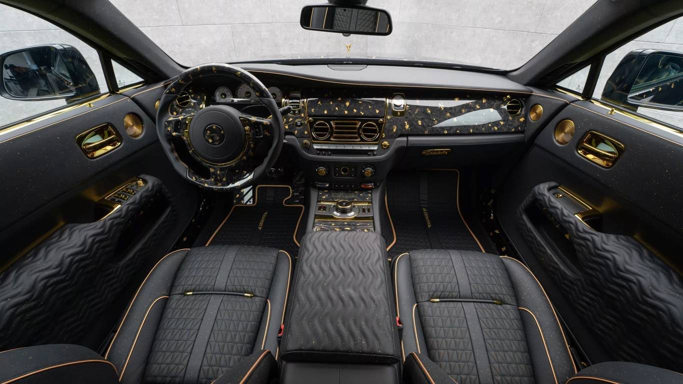 В салоне золото занимает центральное место: им отделаны приборная панель, руль, педали, центральная консоль, дверные ручки и даже решётки динамиков. Интерьер обшит чёрной кожей с золотыми вкраплениями, контрастной прострочкой и кантом, создавая ощущение настоящей ювелирной работы.