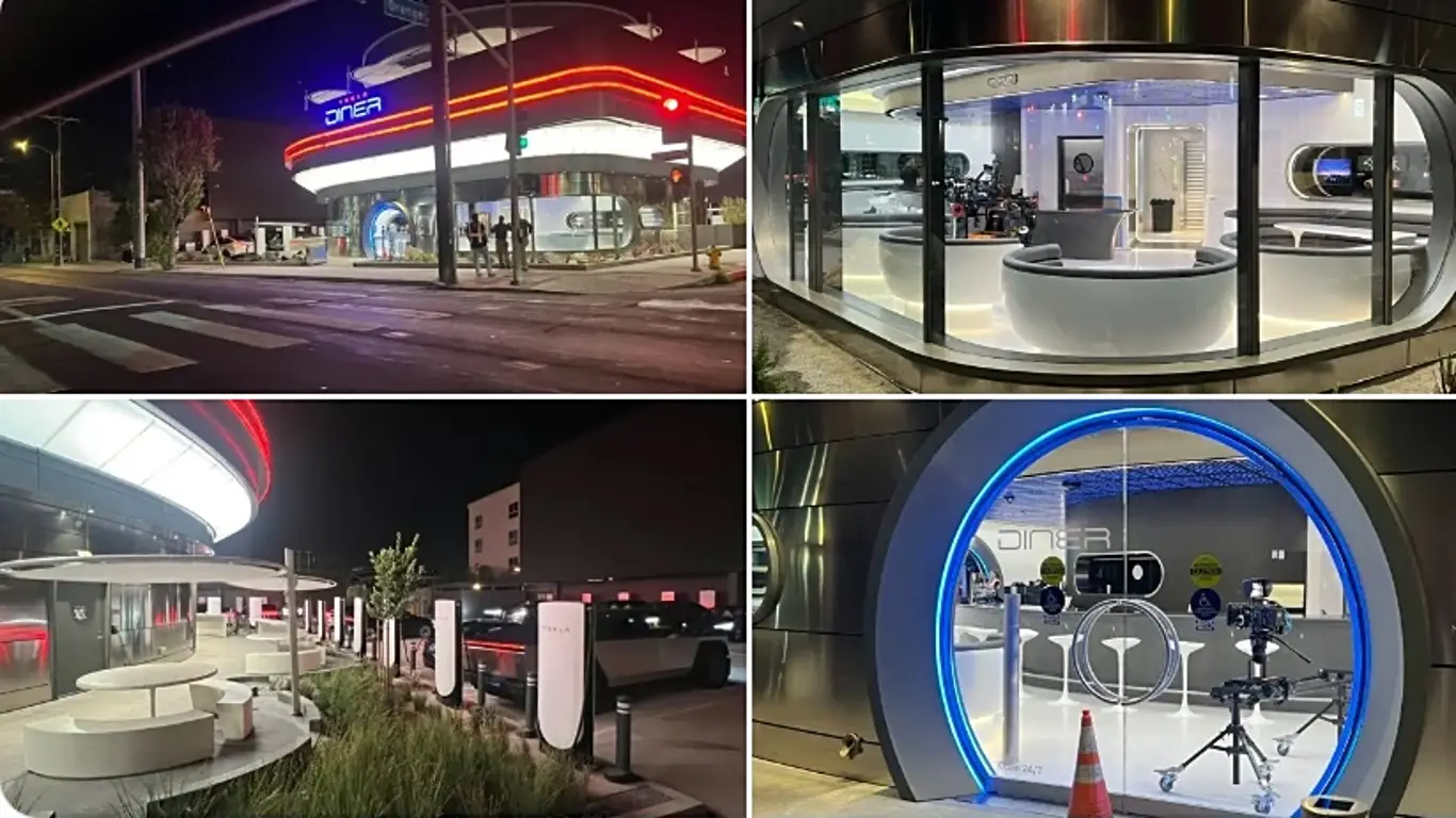 В Калифорнии завершается строительство первого фирменного ресторана Tesla. По данным блогера Сойера Мерритта, заведение на бульваре Санта-Моника в Лос-Анджелесе уже сняло строительные ограждения и вот-вот откроется.Ресторан выполнен в ретро-стиле с неоновыми огнями и дизайном, вдохновлённым автокинотеатрами 1950-х годов. Серебристые линии фасада, яркая подсветка и атмосфера «классической Америки» создают эффектную картинку особенно в тёмное время суток. Внутри — ароматы свежих бургеров и молочных коктейлей.Но главное — это не только еда. Tesla совместила ресторан с полноценным автокинотеатром, оснащённым двумя LED-экранами высотой 13,7 м и сразу 80 скоростными зарядными станциями V4 Supercharger. Посетители смогут одновременно смотреть кино и заряжать электромобиль, не выходя из машины.Ожидается, что открытие состоится уже в ближайшие дни. Для Tesla это не просто заведение общепита, а новая попытка сделать зарядку авто частью современного досуга.