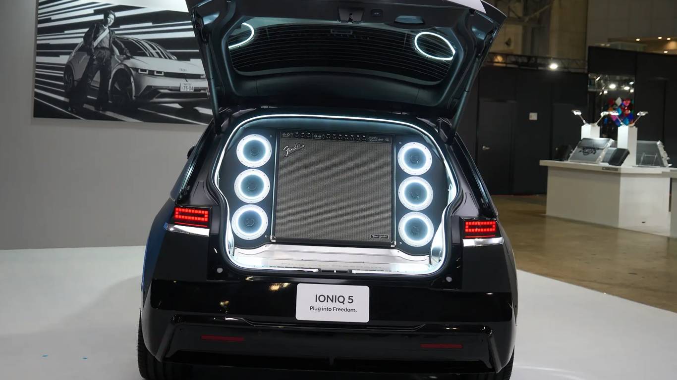 Главным элементом концепта стал встроенный в багажный отсек гитарный усилитель, подключённый к системе внешнего энергопитания V2L. Идея проста: электромобиль становится сценой, где владельцы могут создавать собственные перформансы в любом месте. Визуально автомобиль оформлен как «живой» музыкальный инструмент, вдохновлённый эстетикой усилителей.