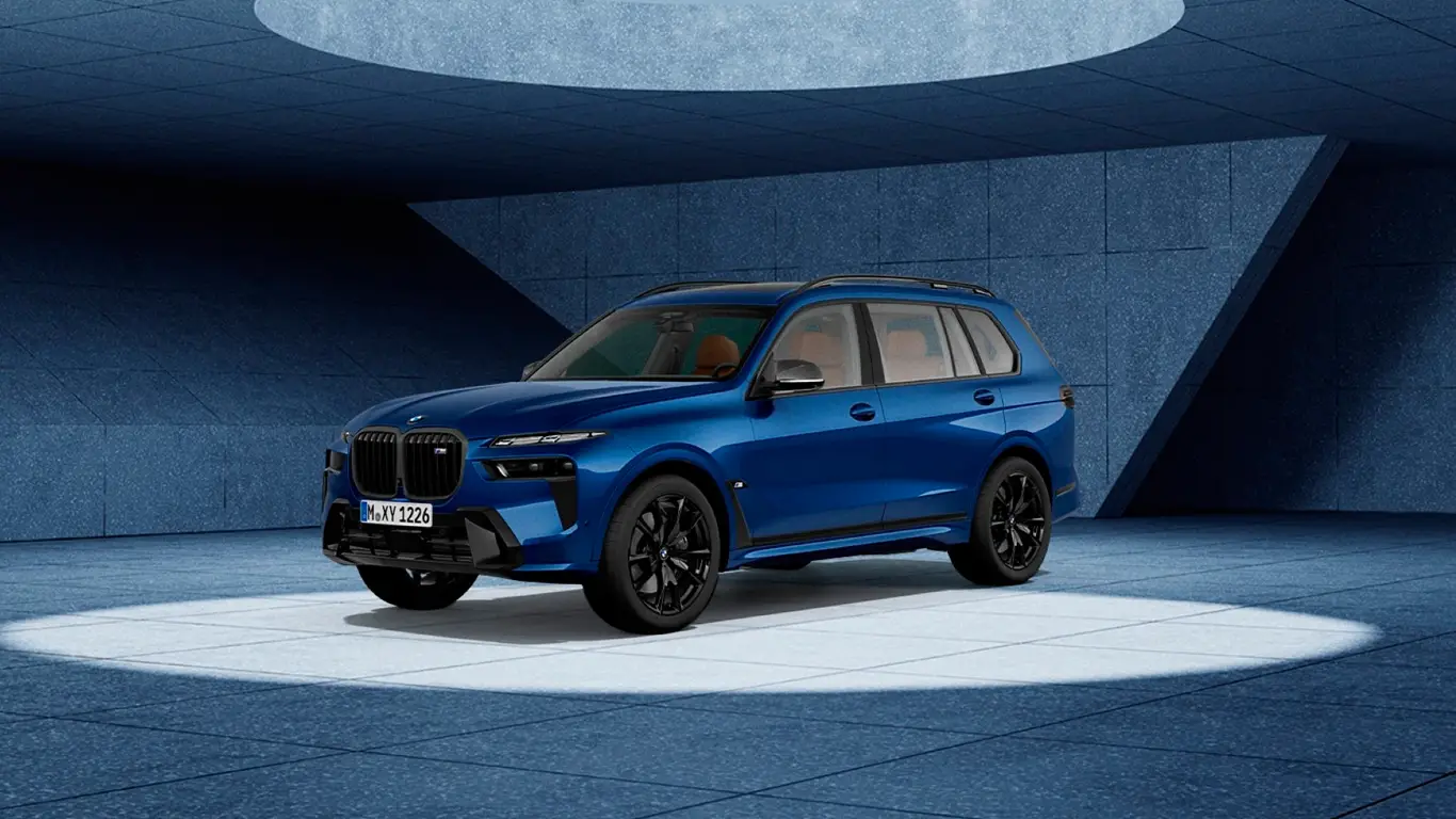 Первая версия — BMW X7 M60i xDrive M Sport Pro Marina Bay Blue Edition. Модель получила фирменный цвет M Marina Bay Blue Metallic, черную решетку радиатора с подсветкой BMW Kidney Iconic Glow и адаптивные LED-фары с темными элементами. Автомобиль оснащен 22-дюймовыми колесами и карбоновыми корпусами зеркал.