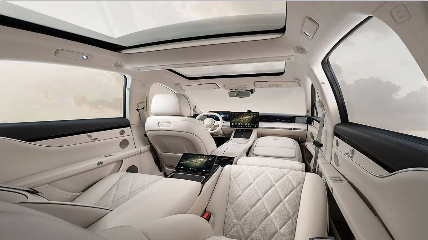 Салон Stelato S9 выполнен в бежевой цветовой гамме и имеет четырехместную компоновку. В кокпите установлен трехспицевый многофункциональный кожаный руль, большой плавающий центральный экран управления и полноценная ЖК-панель приборов. Точные размеры не раскрыты на данный момент, однако операционная система Huawei HarmonyOS обеспечит работу всех функций автомобиля.