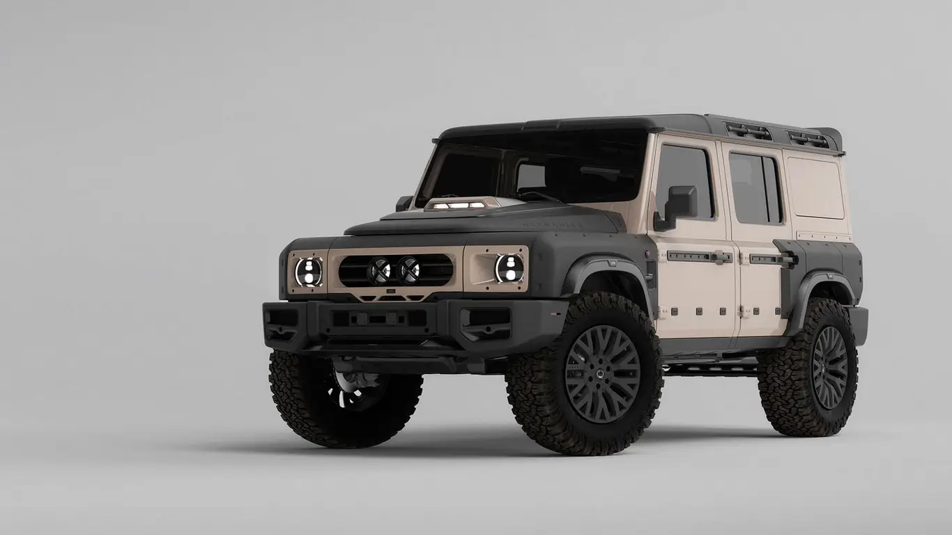 Grenadier получил множество карбоновых деталей: решетку Dakar с интегрированными «X»-масками, широкие колесные арки и бампер, накладку на капоте с LED-подсветкой и массивные верхние спойлеры. В экстерьере также выделяются черные 20-дюймовые диски и агрессивные 37-дюймовые шины для бездорожья.
