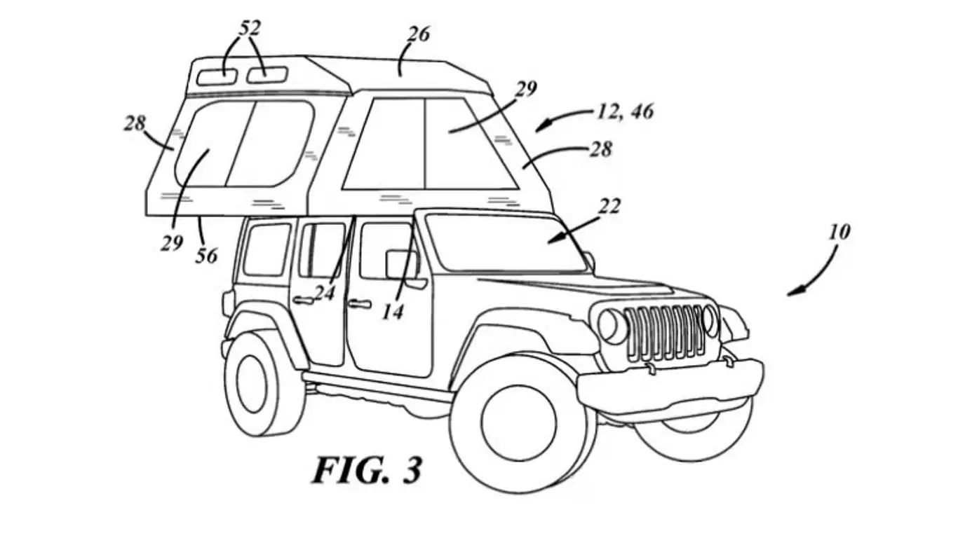 Компания Jeep подала патенты на два новых аксессуара, которые могут заинтересовать любителей активного отдыха. Первый патент касается палатки, специально разработанной для Wrangler. Она крепится на место съемных панелей крыши, используя штатные точки крепления. Такое решение упрощает установку, снижает аэродинамическое сопротивление и позволяет попадать в палатку прямо из салона автомобиля.