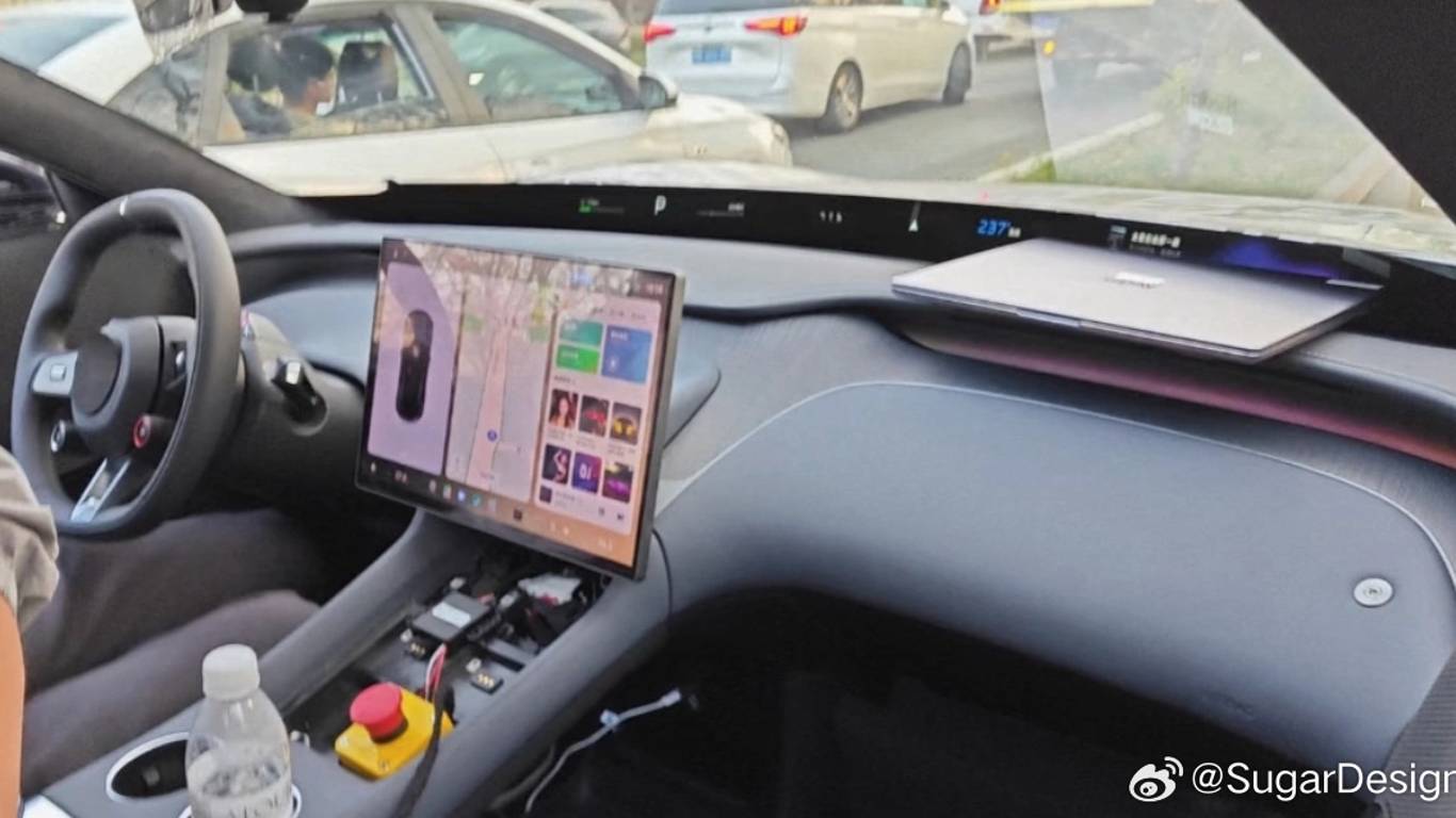Руль — как у SU7 Ultra, центральная консоль полностью сенсорная, с перенесёнными в центр подстаканниками. Также заметна RGB-подсветка и «чистый» стиль управления без традиционных элементов.
